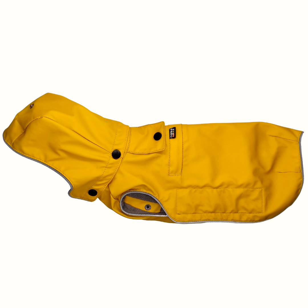 Kun omistajalla on klassikko päällä, ei koirankaan tarvitse jäädä tyylistä jälkeen – Stream-sadetakki on koirien oma versio Rukan legendaarisesta keltaisesta sadetakista.